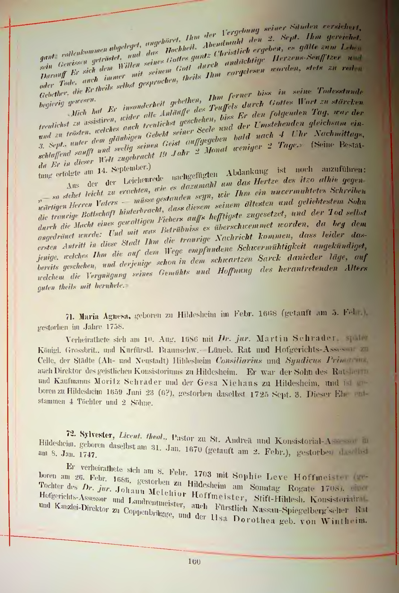 72. Sylvester, Licent. theol., Pastor zu St. Andreä und Konsistorial-Assessor in Hildesheim, geboren daselbst am 31. Jan. 1670 (getauft am 2. Febr.), gestorbeu daselbst am 8. Jan. 1747.