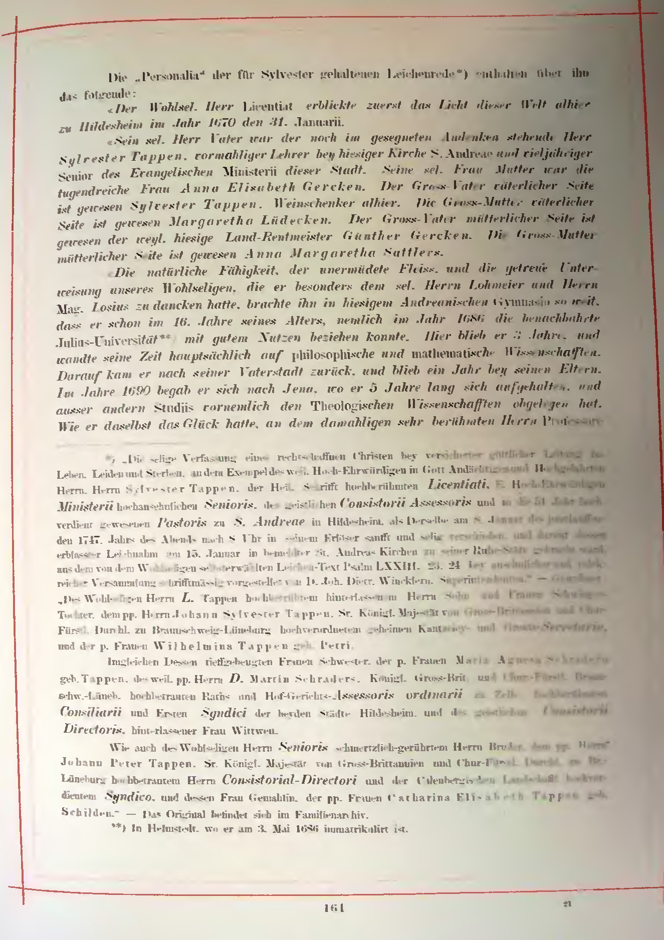 Wie auch des Wohlseligen Herrn Senioris schmertzlich-gerührtem Herrn Bruder, dem pp. Herrn Johann Peter Tappen, Sr. Königl. Majestät von Gross-Brittannien und Chur-Fürstl. Durchl. zu Br.-Lüneburg hochbetrautem Herrn Consistorial-Directori und der Calenbergischen Landschaft hochverdientem Syndico, und dessen Frau Gemahlin, der pp. Frauen Catharina Elisabeth Tappen geb. Schilden.“ - Das Original befindet sich im Familienarchiv. - ↑ In Helmstedt, wo er am 1 Mai 1686 immatrikulirt ist.