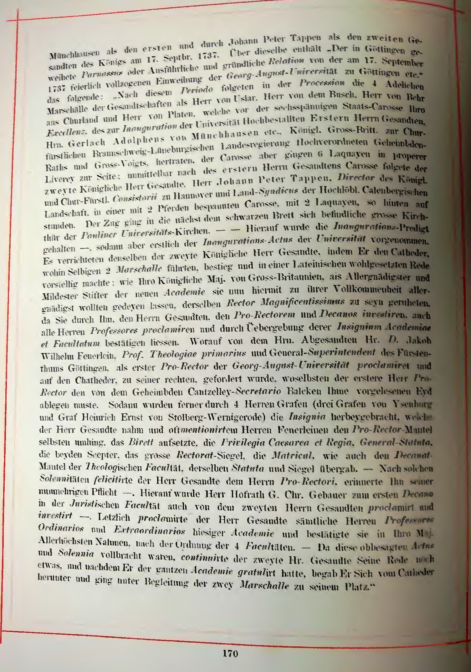 Münchhausen als den ersten und durch Johann Peter Tappen als den zweiten Gesandten des Königs am 17. Septbr. 1737. Über dieselbe enthält „Der in Göttingen geweihete Parnassus oder Ausführliche und gründliche Relation von der am 17. September 1737 feierlich vollzogenen Einweihung der Georg-August-Universität zu Göttingen etc," das folgende: „Nach diesem Periodo folgeten in der Procession die 4 Adelichen Marschälle der Gesandtschaften als Herr von Uslar, Herr von dem Busch, Herr von Behr aus Churland uud Herr von Platen, welche vor der sechsspännigen Staats-Carosse Ihro Excellenz, des zur Inauguration der Universität Hochbestallten Erstern Herrn Gesandten, Hrn. Gerlach Adolphens von Münchhausen etc., Königl. Gross-Britt. zur Chur-fürstlichen Braunschweig-Lüneburgischen Landesregierung Hochverordneten Geheimden-Raths und Gross-Voigts, hertraten, der Carosse aber gingen 6 Laquayen in properer Liverey zur Seite; unmittelbar nach des erstern Herrn Gesandtens Carosse folgete der zweyte Königliche Herr Gesandte, Herr Johann Peter Tappen, Director des Königl. und Chur-Fürstl. Consistorii zu Hannover und Land-Syndicus der Hochlöbl. Calenbergischen Landschaft, in einer mit 2 Pferden bespannten Carosse, mit 2 Laquayen, so hinten auf stunden. Der Zug ging in die nächst dem schwarzen Brett sich befindliche grosse Kirchthür der Pauliner Universitäts-Kirchen. - - Hierauf wurde die Inaugurations-Predigt gehalten -, sodann aber erstlich der Inaugurations-Actus der Universität vorgenotmnen. Es verrichteten denselben der zweyte Königliche Herr Gesandte, indem Er den Catheder, wohin Selbigen 2 Marschalle führten, bestieg und in einer Lateinischen wohlgesetzten Rede vorstellig machte: wie Ihro Königliche Maj. von Gross-Britannien, als Allergnädigster und Mildester Stifter der neuen Academie sie nun hiermit zu ihrer Vollkommenheit allergnädigst wollten gedeyen lassen, derselben Rector Magnificentissimus zu seyn geruheten, da Sie durch Ihn, den Herrn Gesandten, den Pro-Rectorem und Decanos investiren, auch alle Herren Professores proclamiren und durch Üebergebung derer Insignium Academiae et Facultatum bestätigen liessen. Worauf von dem Hrn. Abgesandten Hr. D. Jakob Wilhelm Feuerlein, Prof. Theologiae primarius und General-Superintendent des Fürstenthums Göttingen, als erster Pro-Rector der Georg-August-Universität proclamiret und auf den Chatheder, zu seiner rechten, gefordert wurde, woselbsten der erstere Herr Pro-Rector den von dem Geheimbden Cantzelley-Secretario Balcken Ihme vorgeleseneu Eyd ablegen muste. Sodann wurden ferner durch 4 Herren Grafen (drei Grafen von Ysenburg uud Graf Heinrich Ernst vou Stolberg-Wernigerode) die Insignia herbeygebracht, welche der Herr Gesandte nahm und oftmentionirtem Herren Feuerleinen den Pro-Rector-Mantel selbsten umhing, das Birett aufsetzte, die Privilegia Caesarea et Regia, General-Statuta, die beyden Scepter, das grosse Rectorat-Siegel, die Matricul, wie auch den Decanat-Mantel der Theologischen Facultät, derselben Statuta und Siegel übergab. - Nach solchen Solennitäten felicitirte der Herr Gesandte dem Herrn Pro-Rectori, erinnerte Ihn seiner nunmehrigen Pflicht -. Hierauf wurde Herr Hofrath G. Chr. Gebauer zum ersten Decano in der Juristischen Facultät auch von dem zweyten Herrn Gesandten proclomirt und investirt -. Letzlich proclamirte der Herr Gesandte sämtliche Herren Professorres Ordinarios und Extraordinarios hiesiger Academie und bestätigte sie in Ihro Maj. Allerhöchsten Nahmen, nach der Ordnung der 4 Facultäten. - Da diese obbesagten Actus und Solennia vollbracht waren, continuirte der zweyte Hr. Gesandte Seine Rede noch etwas, und nachdem Er der gantzen Academie gratulirt hatte, begab Er Sich vom Catheder herunter uud ging unter Begleitung der zwey Marschalle zu seinem Platz."