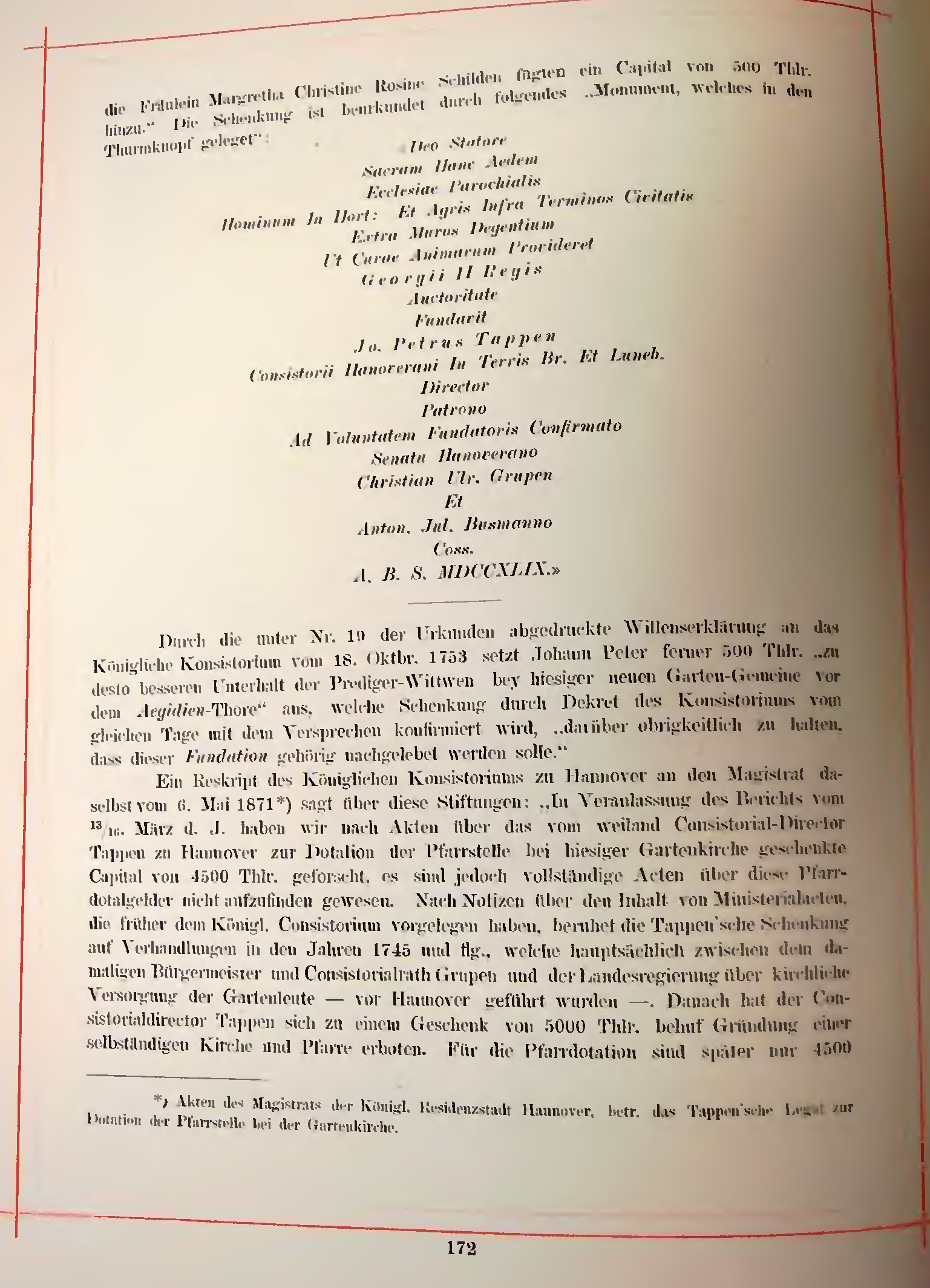 Ein Reskript des Königlichen Konsistoriums zu Hannover an den Magistrat daselbst vom 6. Mai 1871[1] sagt über diese Stiftungen: „In Veranlassung des Berichts vom 13/16. März d. J. haben wir nach Akten über das vom weiland Consistorial-Director Tappen zu Hannover zur Dotation der Pfarrstelle bei hiesiger Gartenkirche geschenkte Capital von 4500 Thlr. geforscht, es sind jedoch vollständige Acten über diese Pfarrdotalgelder nicht aufzufinden gewesen. Nach Notizen über den Inhalt von Ministerialacten, die früher dem Königl. Consistorium vorgelegen haben, beruhet die Tappen’sche Schenkung auf Verhandlungen in den Jahren 1745 und flg., welche hauptsächlich zwischen dem damaligen Bürgermeister und Consistorialrath Grupen und der Landesregierung über kirchliche Versorgung der Gartenleute - vor Hannover geführt wurden -. Danach hat der Consistorialdirector Tappen sich zu einem Geschenk von 5000 Thlr. behuf Gründung einer selbständigen Kirche und Pfarre erboten. Für die Pfarrdotation sind später nur 4500