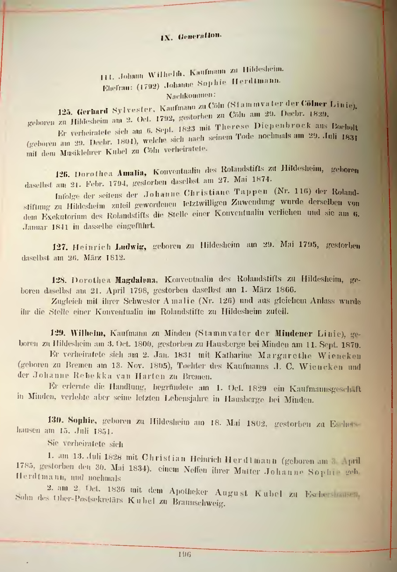 129. Wilhelm, Kaufmann zu Minden (Stammvater der Mindener Linie), geboren zu Hildesheim am 3. Oct. 1800, gestorben zu Hausberge bei Minden am 11. Sept. 1870.