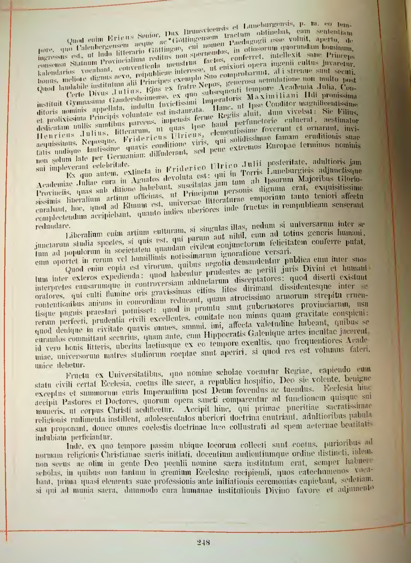 Certe Divus Julius, Ejus ex fratre Nepos, generosa aemulatione non multo post instituit Gymnasium Gandersheimense, ex quo subsequenti tempore Academia Julia, Conditoris nominis appellata, indultu Invictissimi Imperatoris Maximiliani IIdi pronissima et prolixissima Principis voluntato est instaurata. Hane, ut Ipse Conditor magnificentissime dedicatam nullis sumtibus parceus, impensis ferme Regiis aluit, dum vivebat: Sic Filius, Henricus Julius, litterarum, ut quas Ipse haud perfunctorie culuerat, aestimator aequissimus, Neposque, Fridericus Ulricus, clementissime foverunt et ornarunt, invitatis undique lautissime quavis eonditioue viris, qui solidissimae famam eruditionis suae non solum late per Germaniam diffiderant, sed pene extremos Europae terminos nominis sui impleverant celebritate.