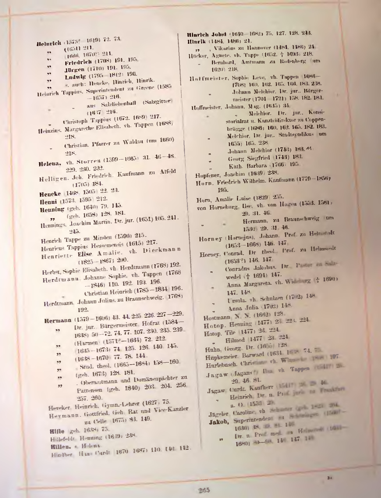 | Henrich Tappe zu Minden (1590), 215 | Horney (Hornejus), Johann, Prof. zu Helmstedt (1653-1668) 146, 147 |