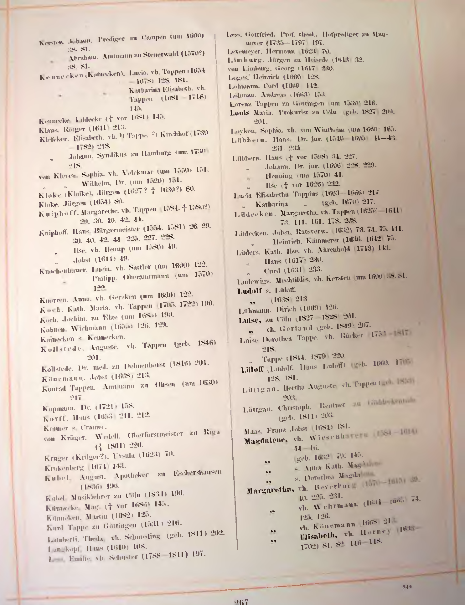 | Kollstede, Auguste, vh. Tappen (geb. 1846) 201 | Ludewigs, Mechtildis, vh. Kersten (um 1600) 38, 81 |