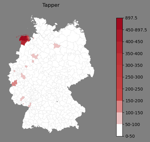Relative Verteilung des Namens Tapper (1996)Direkt zur Karte Die Farbskala zeigt die Anzahl von "Tapper" bezogen auf je 1 Million Einträge. |