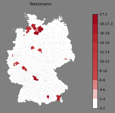 Relative Verteilung des Namens Teetzmann (1996)Direkt zur Karte Die Farbskala zeigt die Anzahl von "Teetzmann" bezogen auf je 1 Million Einträge. |