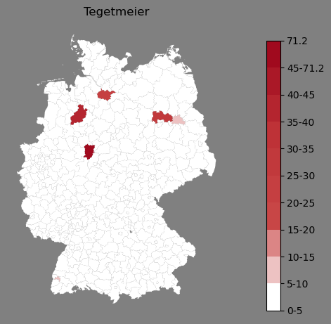 Relative Verteilung des Namens Tegetmeier (1996)Direkt zur Karte Die Farbskala zeigt die Anzahl von "Tegetmeier" bezogen auf je 1 Million Einträge. |