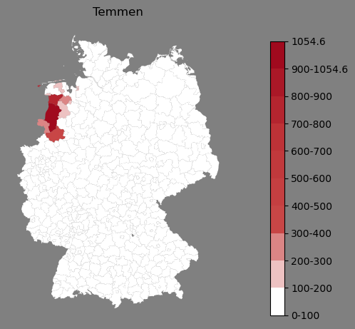 Relative Verteilung des Namens Temmen (1996)Direkt zur Karte Die Farbskala zeigt die Anzahl von "Temmen" bezogen auf je 1 Million Einträge. |