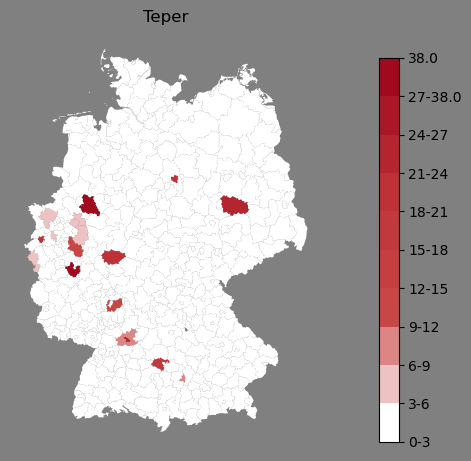 Relative Verteilung des Namens Teper (1996)Direkt zur Karte Die Farbskala zeigt die Anzahl von "Teper" bezogen auf je 1 Million Einträge. |