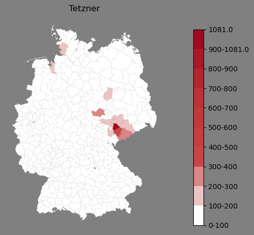 Relative Verteilung des Namens Tetzner (1996)Direkt zur Karte Die Farbskala zeigt die Anzahl von "Tetzner" bezogen auf je 1 Million Einträge. |