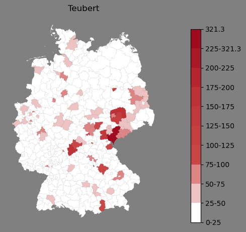 Relative Verteilung des Namens Teubert (1996)Direkt zur Karte Die Farbskala zeigt die Anzahl von "Teubert" bezogen auf je 1 Million Einträge. |