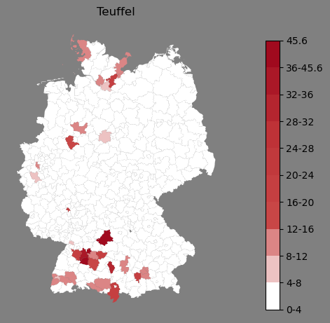 Relative Verteilung des Namens Teuffel (1996)Direkt zur Karte Die Farbskala zeigt die Anzahl von "Teuffel" bezogen auf je 1 Million Einträge. |