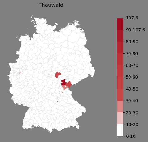 Relative Verteilung des Namens Thauwald (1996)Direkt zur Karte Die Farbskala zeigt die Anzahl von "Thauwald" bezogen auf je 1 Million Einträge. |