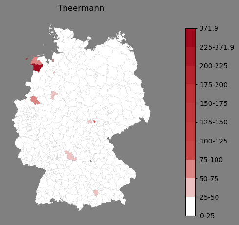 Relative Verteilung des Namens Theermann (1996)Direkt zur Karte Die Farbskala zeigt die Anzahl von "Theermann" bezogen auf je 1 Million Einträge. |