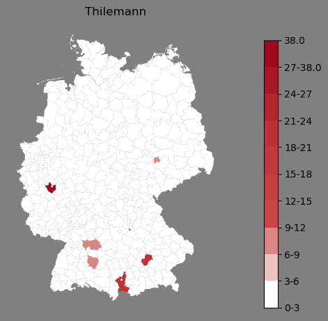 Relative Verteilung des Namens Thilemann (1996)Direkt zur Karte Die Farbskala zeigt die Anzahl von "Thilemann" bezogen auf je 1 Million Einträge. |
