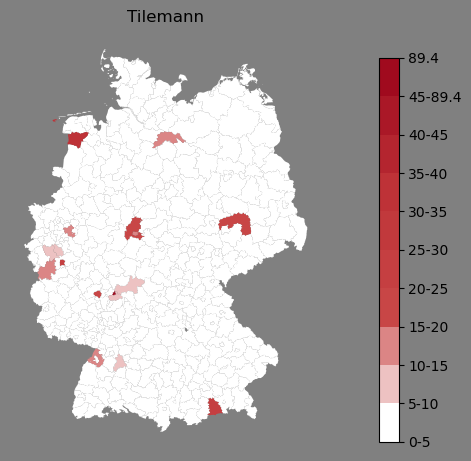 Relative Verteilung des Namens Tilemann (1996)Direkt zur Karte Die Farbskala zeigt die Anzahl von "Tilemann" bezogen auf je 1 Million Einträge. |