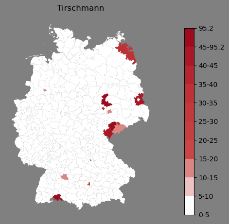 Absolute Verteilung des Namens Tirschmann (1890)Direkt zur Karte Absolute Verteilung des Namens "Tirschmann" um 1890 im damaligen Deutschen Reich Sie können die Karte innerhalb des Fensters zoomen und verschieben. |