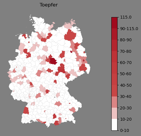 Absolute Verteilung des Namens Toepfer (1890)Direkt zur Karte Absolute Verteilung des Namens "Toepfer" um 1890 im damaligen Deutschen Reich Sie können die Karte innerhalb des Fensters zoomen und verschieben. |