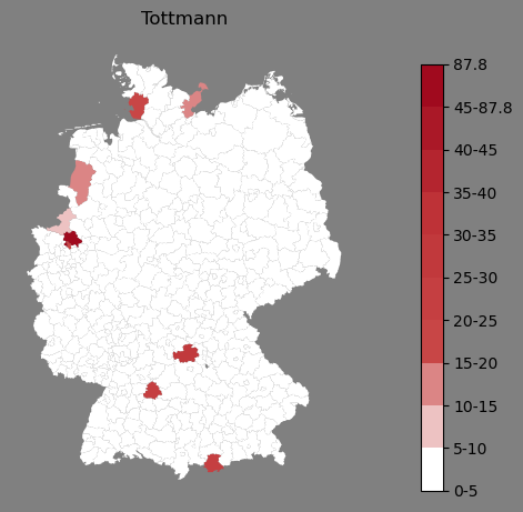 Relative Verteilung des Namens Tottmann (1996)Direkt zur Karte Die Farbskala zeigt die Anzahl von "Tottmann" bezogen auf je 1 Million Einträge. |