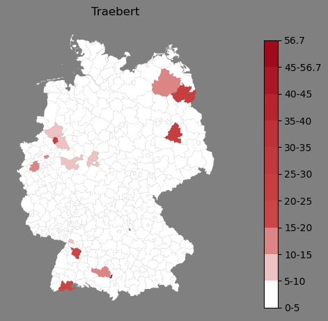 Relative Verteilung des Namens Traebert (1996)Direkt zur Karte Die Farbskala zeigt die Anzahl von "Traebert" bezogen auf je 1 Million Einträge. |