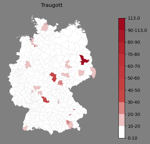 Relative Verteilung des Namens Traugott (1996)Direkt zur Karte Die Farbskala zeigt die Anzahl von "Traugott" bezogen auf je 1 Million Einträge. |
