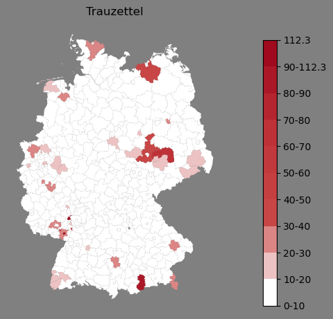 Relative Verteilung des Namens Trauzettel (1996)Direkt zur Karte Die Farbskala zeigt die Anzahl von "Trauzettel" bezogen auf je 1 Million Einträge. |