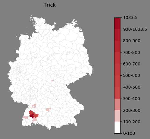 Absolute Verteilung des Namens Trick (1890)Direkt zur Karte Absolute Verteilung des Namens "Trick" um 1890 im damaligen Deutschen Reich Sie können die Karte innerhalb des Fensters zoomen und verschieben. |