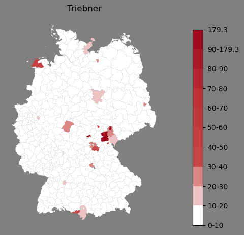 Relative Verteilung des Namens Triebner (1996)Direkt zur Karte Die Farbskala zeigt die Anzahl von "Triebner" bezogen auf je 1 Million Einträge. |