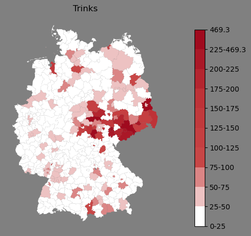 Relative Verteilung des Namens Trinks (1996)Direkt zur Karte Die Farbskala zeigt die Anzahl von "Trinks" bezogen auf je 1 Million Einträge. |