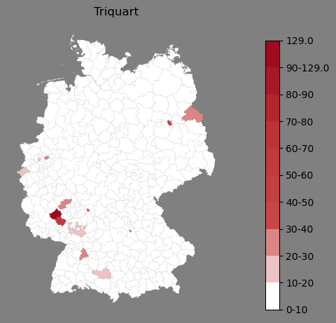 Relative Verteilung des Namens Triquart (1996)Direkt zur Karte Die Farbskala zeigt die Anzahl von "Triquart" bezogen auf je 1 Million Einträge. |