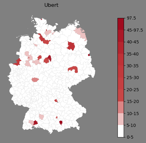 Relative Verteilung des Namens Ubert (1996)Direkt zur Karte Die Farbskala zeigt die Anzahl von "Ubert" bezogen auf je 1 Million Einträge. |
