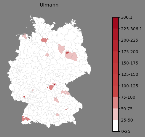 Relative Verteilung des Namens Ulmann (1996)Direkt zur Karte Die Farbskala zeigt die Anzahl von "Ulmann" bezogen auf je 1 Million Einträge. |