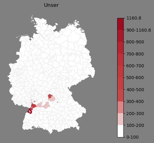 Relative Verteilung des Namens Unser (1996)Direkt zur Karte Die Farbskala zeigt die Anzahl von "Unser" bezogen auf je 1 Million Einträge. |