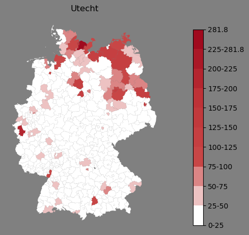 Relative Verteilung des Namens Utecht (1996)Direkt zur Karte Die Farbskala zeigt die Anzahl von "Utecht" bezogen auf je 1 Million Einträge. |
