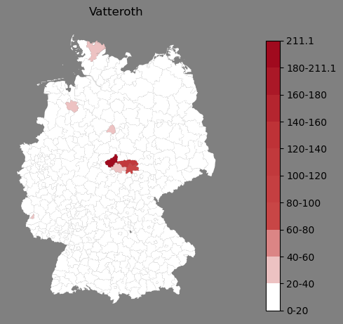 Relative Verteilung des Namens Vatteroth (1996)Direkt zur Karte Die Farbskala zeigt die Anzahl von "Vatteroth" bezogen auf je 1 Million Einträge. |