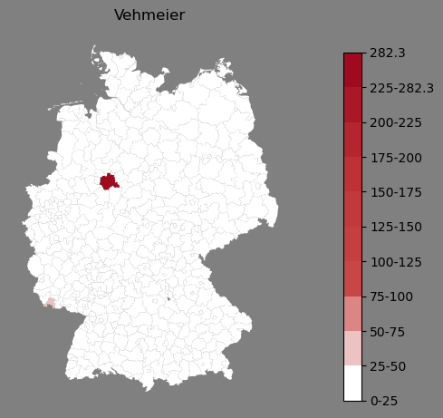 Relative Verteilung des Namens Vehmeier (1996)Direkt zur Karte Die Farbskala zeigt die Anzahl von "Vehmeier" bezogen auf je 1 Million Einträge. |