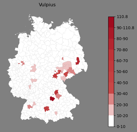 Relative Verteilung des Namens Vulpius (1996)Direkt zur Karte Die Farbskala zeigt die Anzahl von "Vulpius" bezogen auf je 1 Million Einträge. |