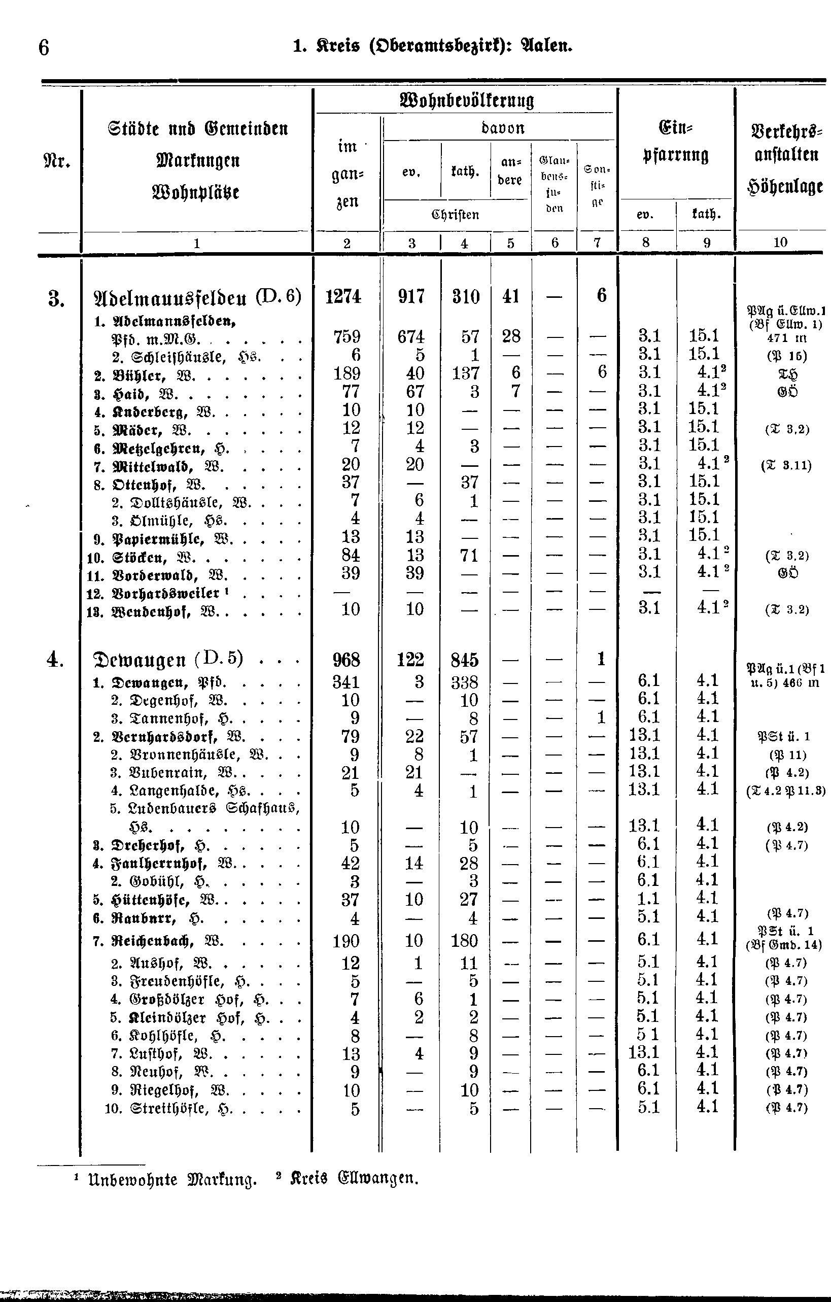 Wohnbevölkerung | Einpfarrung | Verkehrs-anstalten Höhenlage | ||||||