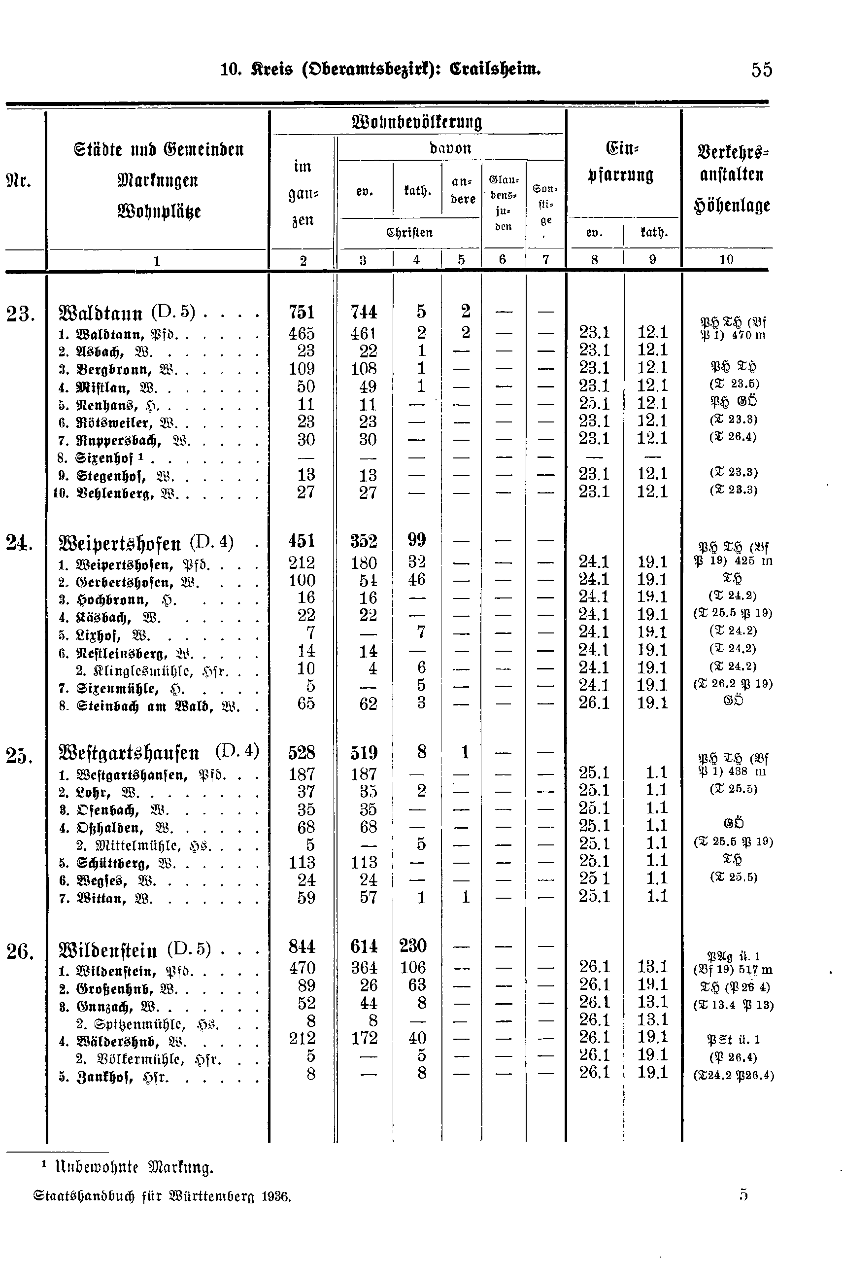 Wohnbevölkerung | Einpfarrung | Verkehrs-anstalten Höhenlage | ||||||