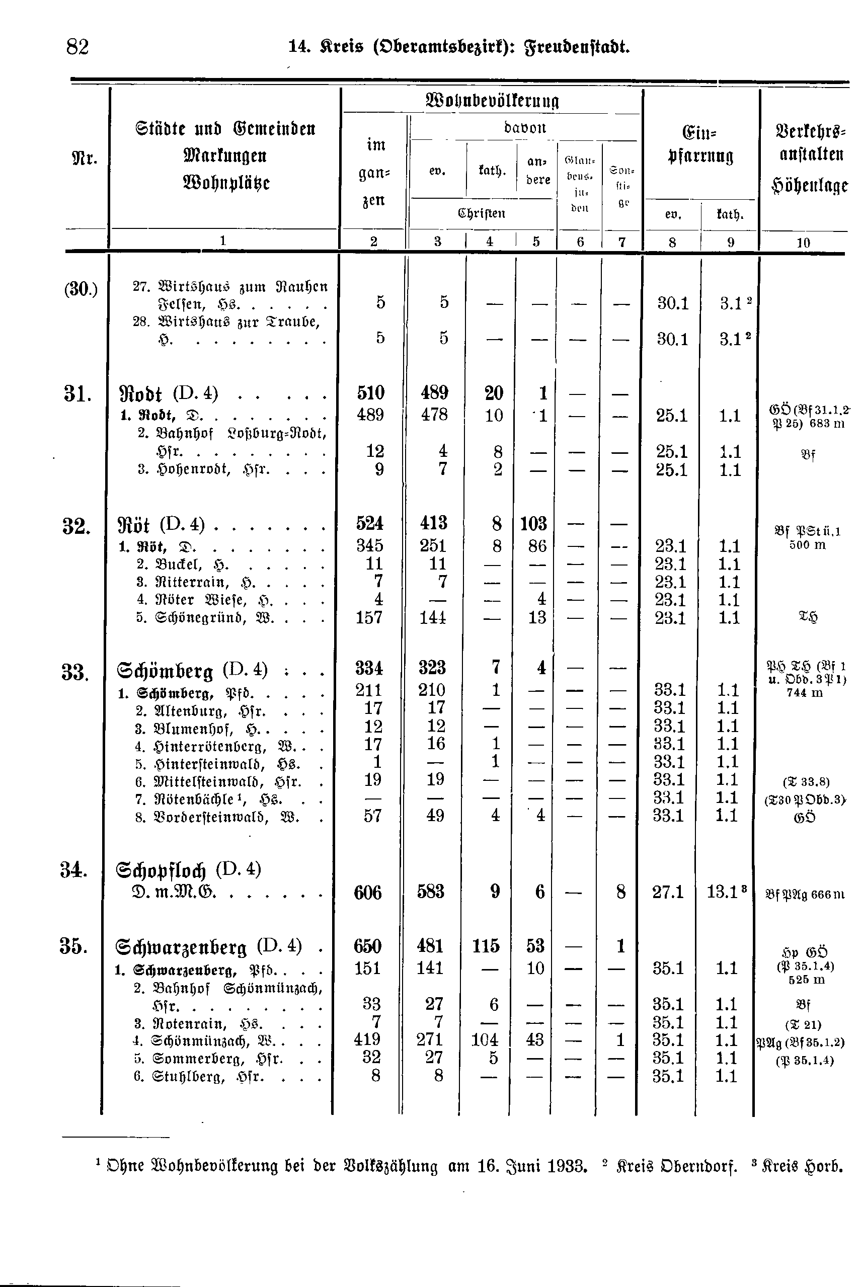 Wohnbevölkerung | Einpfarrung | Verkehrs-anstalten Höhenlage | ||||||