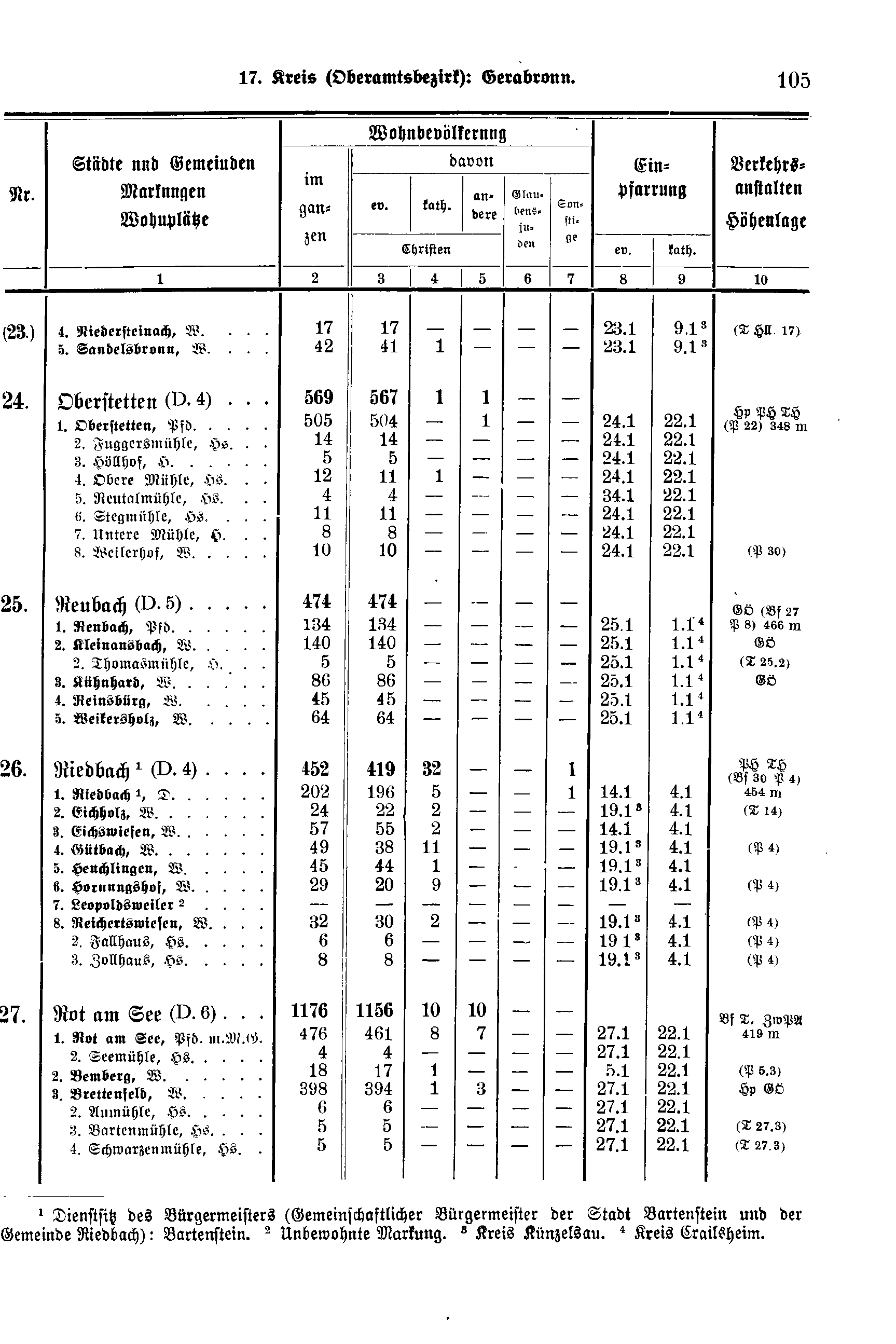 Wohnbevölkerung | Einpfarrung | Verkehrs-anstalten Höhenlage | ||||||
