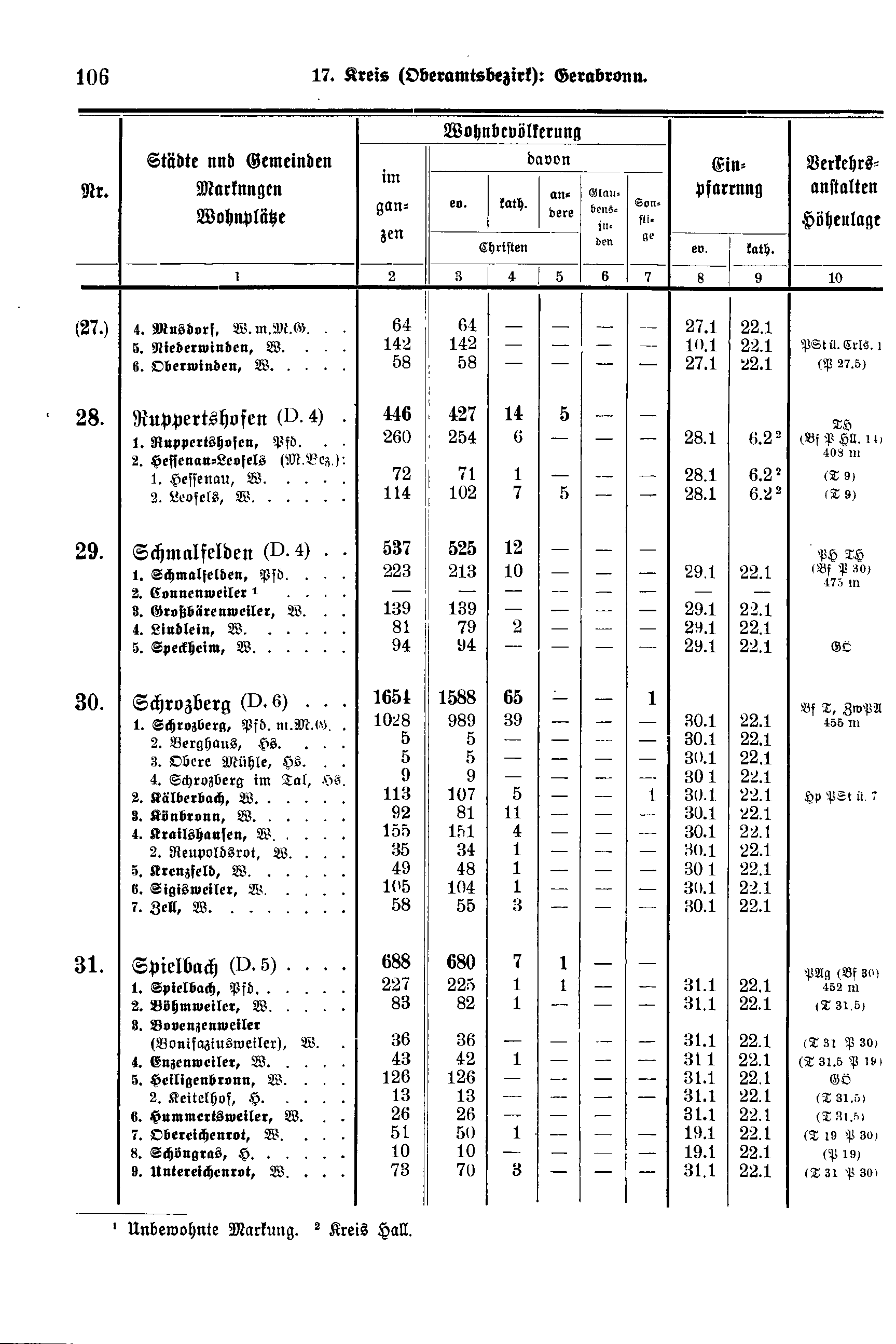 Wohnbevölkerung | Einpfarrung | Verkehrs-anstalten Höhenlage | ||||||