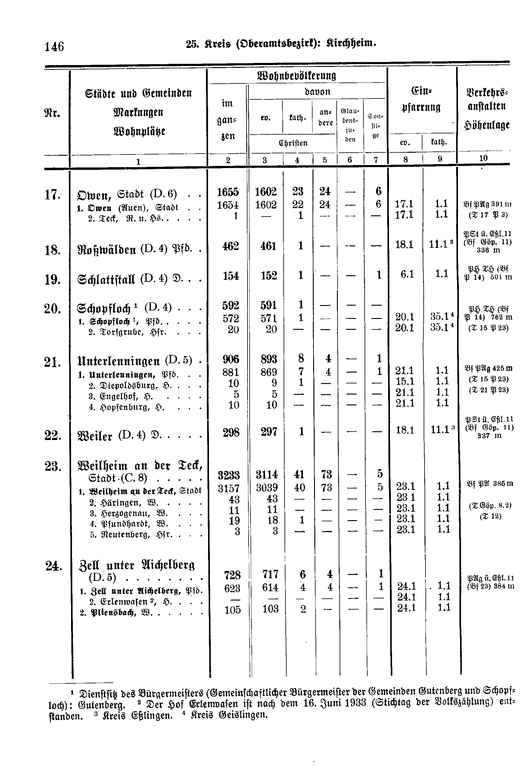 Wohnbevölkerung | Einpfarrung | Verkehrs-anstalten Höhenlage | ||||||