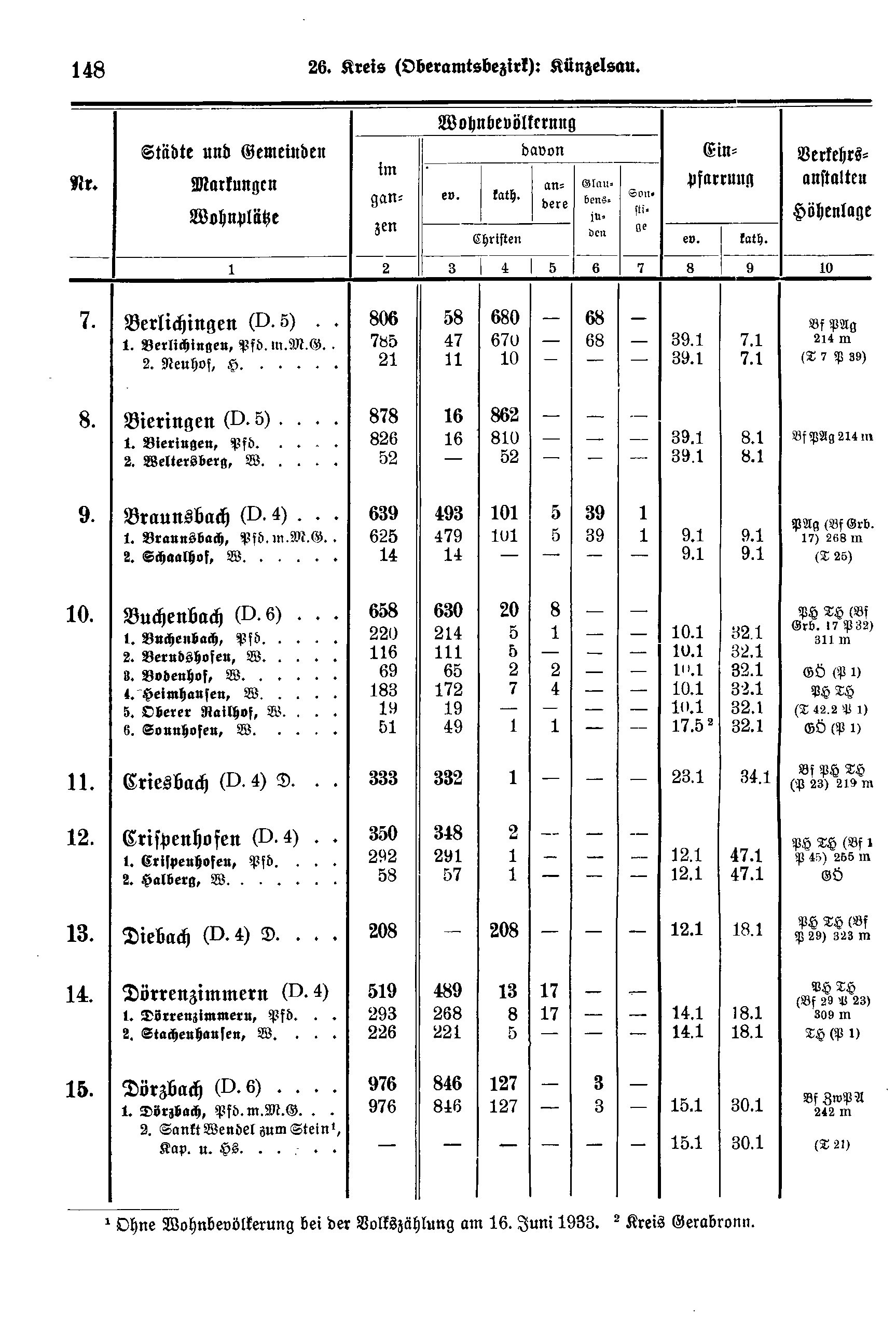 Wohnbevölkerung | Einpfarrung | Verkehrs-anstalten Höhenlage | ||||||