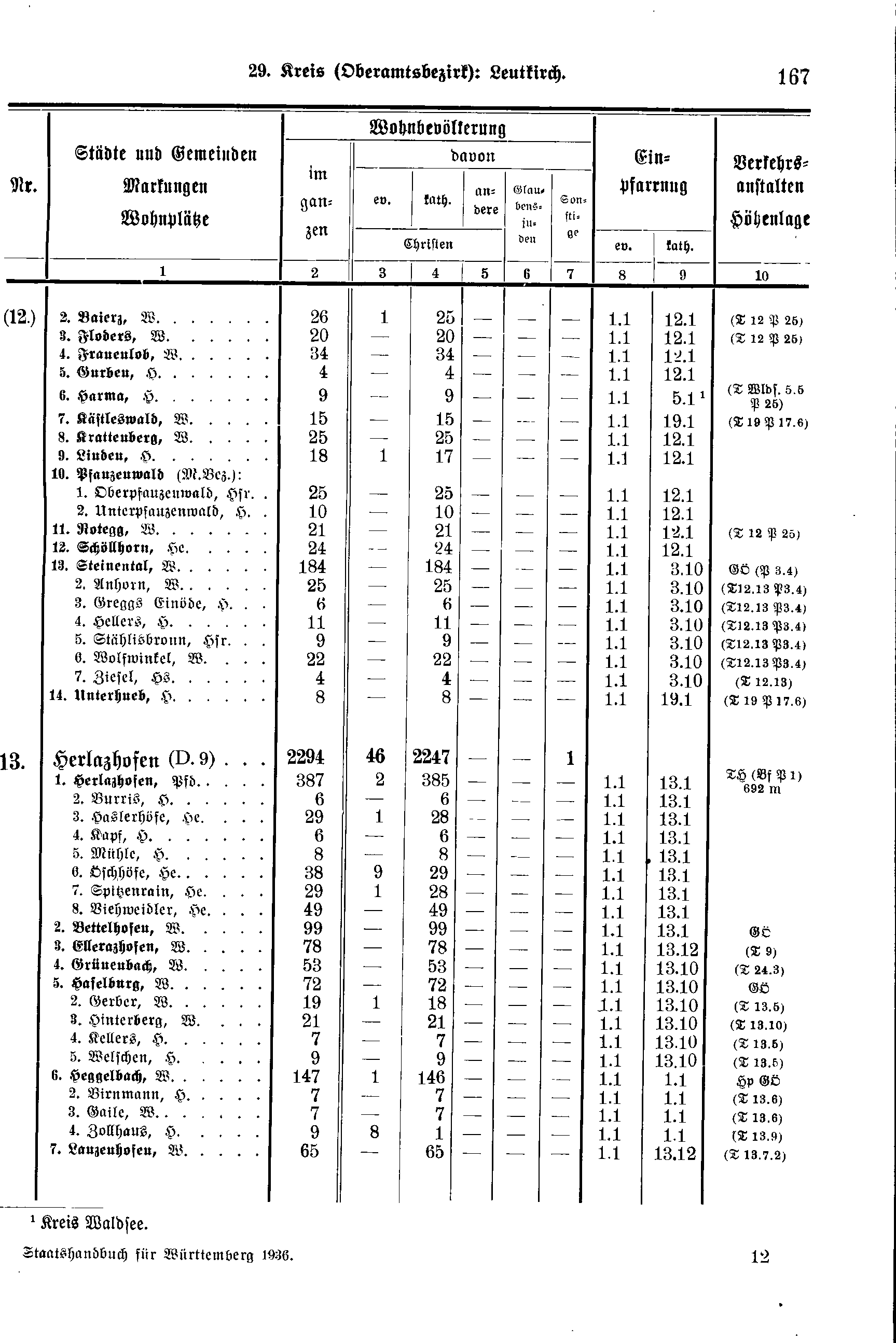 Wohnbevölkerung | Einpfarrung | Verkehrs-anstalten Höhenlage | ||||||