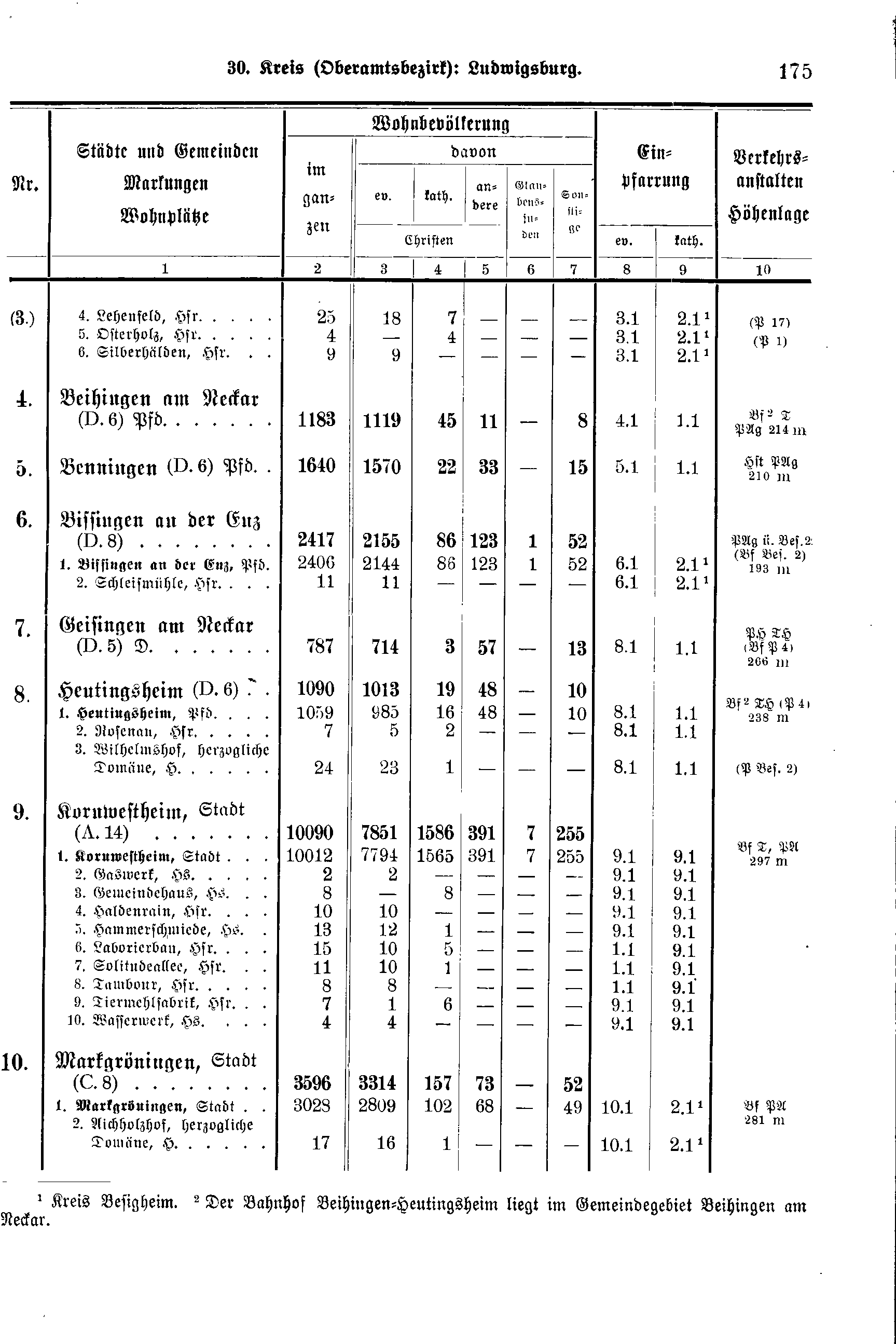 Wohnbevölkerung | Einpfarrung | Verkehrs-anstalten Höhenlage | ||||||
