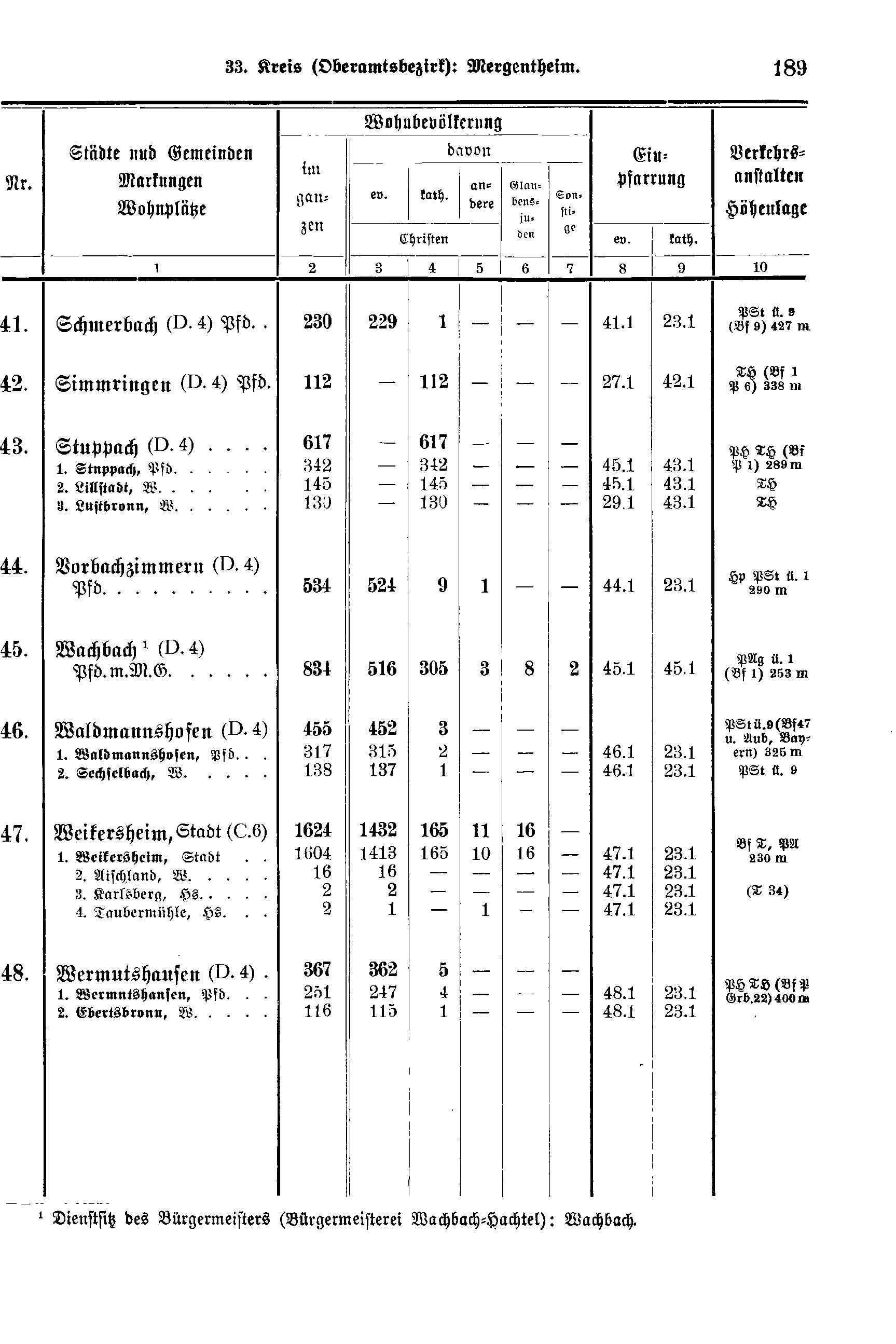 Wohnbevölkerung | Einpfarrung | Verkehrs-anstalten Höhenlage | ||||||