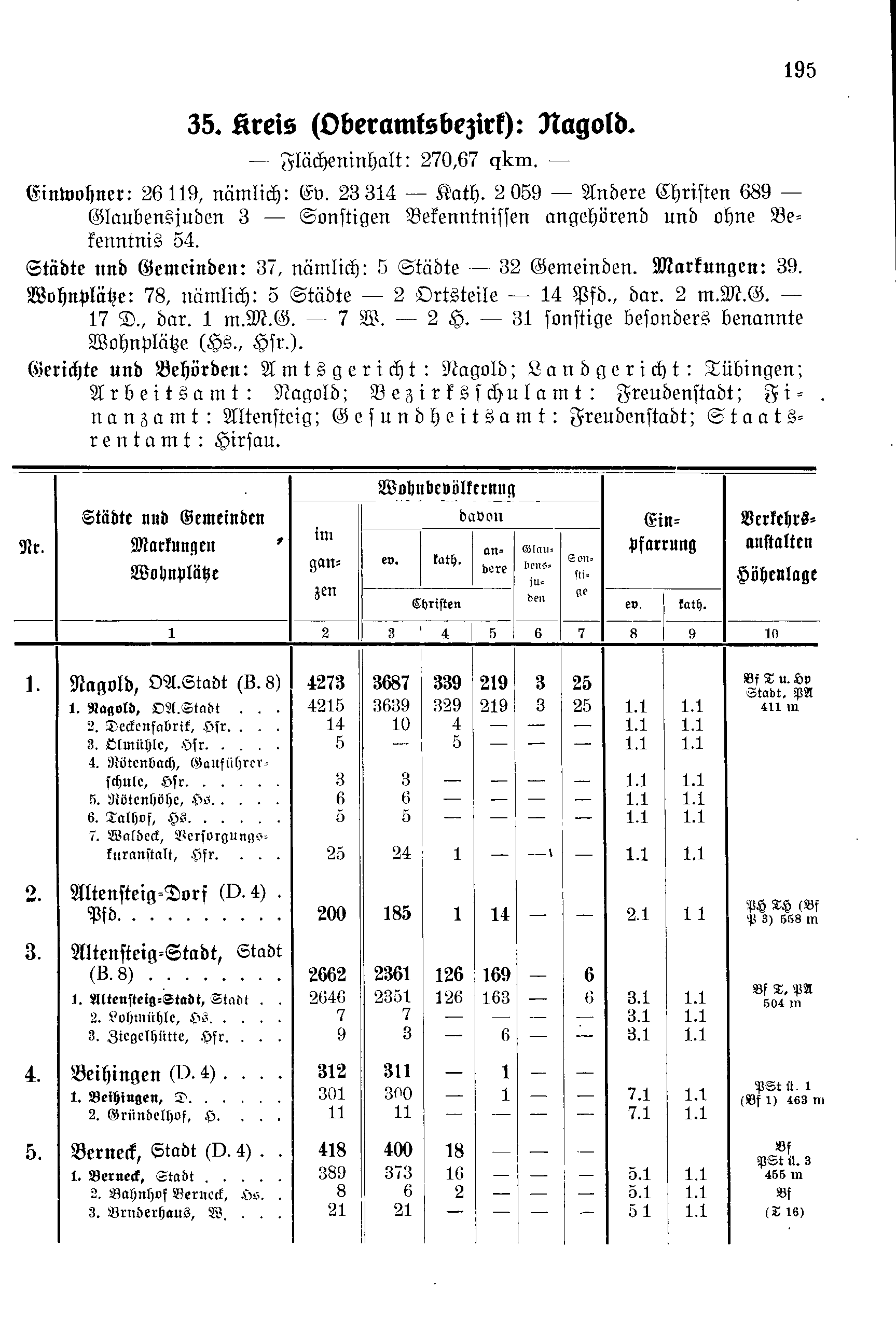 1. Nagold, OA.Stadt 4215 3639 329 219 3 25 1.1 1.1 Bf T u. Hp Stadt, PA 411m