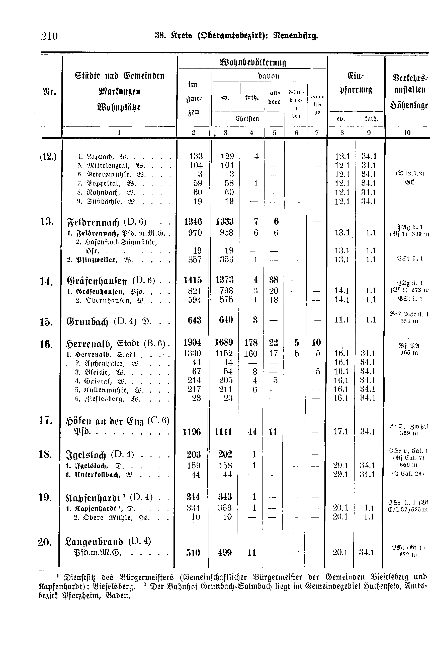 Wohnbevölkerung | Einpfarrung | Verkehrs-anstalten Höhenlage | ||||||