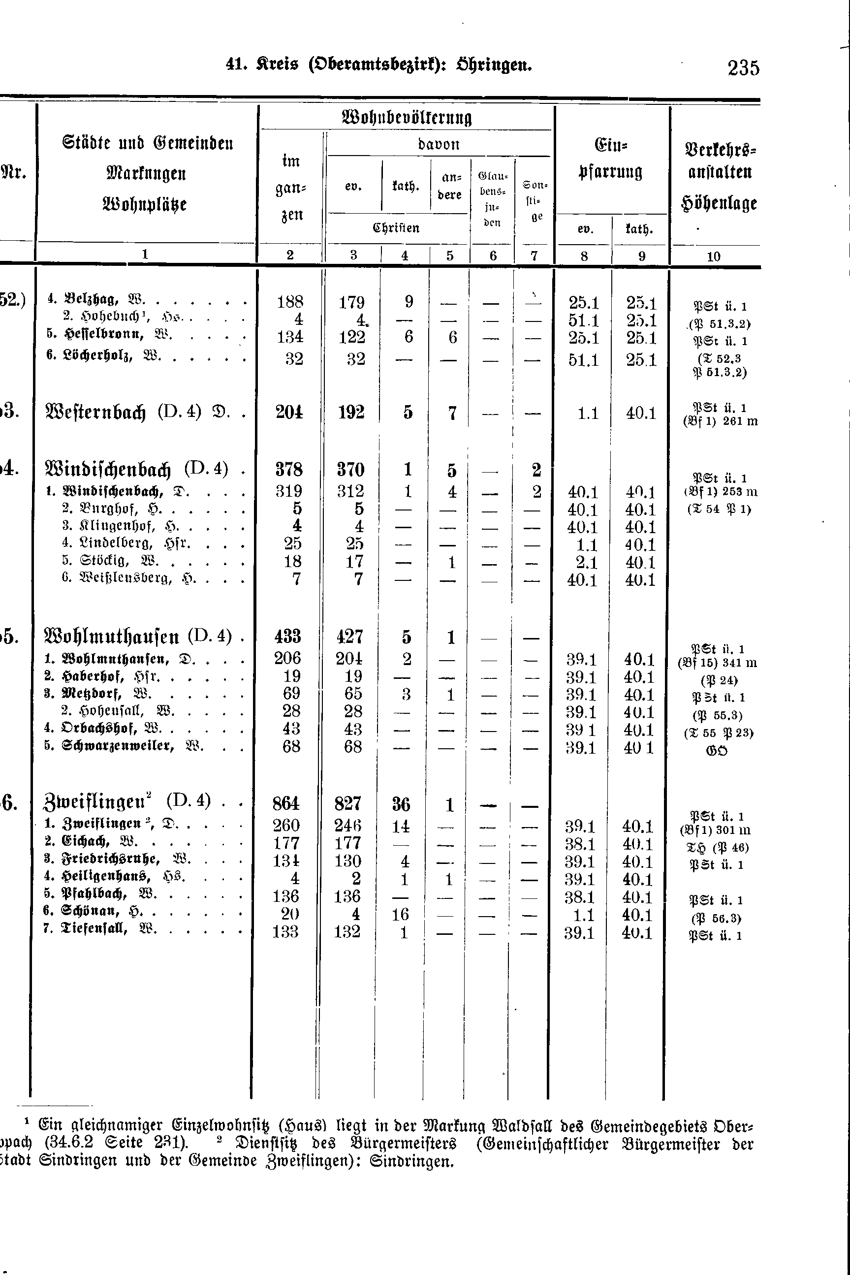 Wohnbevölkerung | Einpfarrung | Verkehrs-anstalten Höhenlage | ||||||
